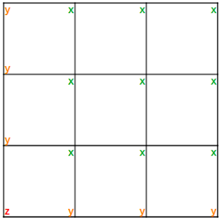 We will have full connectivity information for the nodes marked x, as these appear as the top-right node of a cell. We will not, however, currently have any information for the cells marked y and z as these will never be counted as an N0 node.